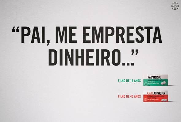 Anúncios excelentes do Eugênio Mohallem para a campanha da Bayer para a Cafiaspirina, aspirina com cafeína (caixa vermelhas), que aumentam o efeito analgésico (nota de um drogado: cafeína tende a fazer isso com várias substâncias, é verdade, aspirina com café aumenta o efeito. Eu gosto de aspirina com glicina, como os russos vendem). É inteligente, é engraçada e, o mais importante, é extremamente eficaz. E é mais um ótimo exemplo de como o texto cria imagens na sua mente.